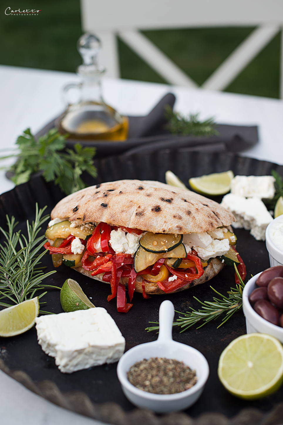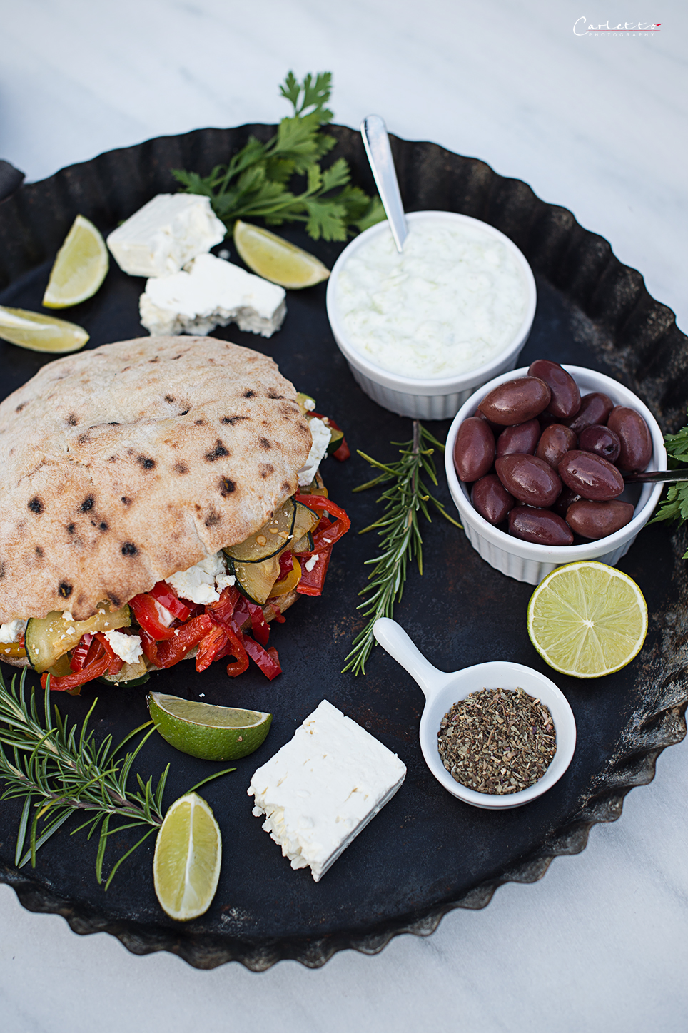 Für die Füllung: Die Paprika waschen, putzen in dünne Streifen schneiden. Die Zucchini waschen und in Scheiben schneiden. Den Knoblauch schälen und in feine Streifen schneiden. Etwas Olivenöl in einer Pfanne erhitzen, das Gemüse darin mehrere Minuten auf mittlerer Hitze anbraten. Mit Kräutersalz und Pfeffer abschmecken. Das Gemüse in die Pitabrote füllen, mit Fetakäse garnieren.